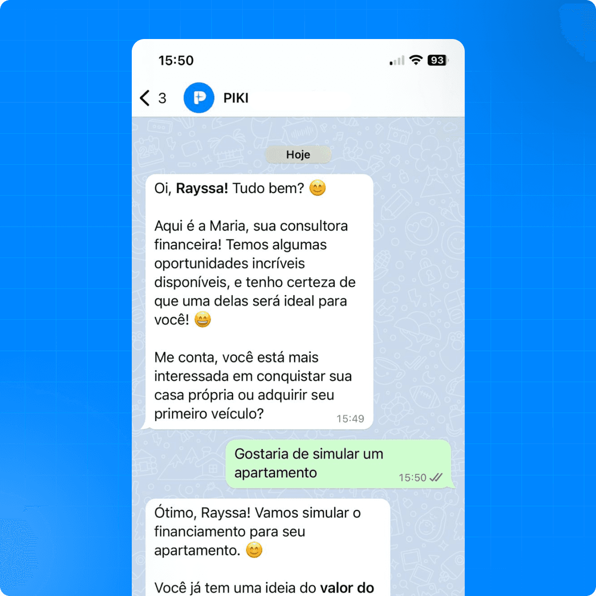 Você tem à disposição um consultor via chatbot, disponível para auxiliar em todo o processo de aquisição de imóveis e automóveis, garantindo orientações e suporte nas melhores escolhas financeiras.